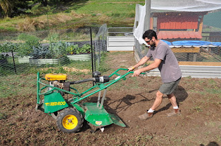 Whilst the raised garden bed patch has been producing beautifully for us, it was time to make a start on the other garden patches. So we decided to hire a rotary hoe. We normally wouldn't want to disturb the soil but the grass on our property is so thick and matted that nothing will grow unless you remove it. I made a start on the second patch with a pick, but after a day of digging and an aching back, had only managed a small portion of it, hence the rotary hoe decision. It was also my plan to use the hoe myself, as Shaun was busy with constructing his aquaponics set up, but after we realised how heavy it was and that it didn't have reverse, meaning at the end of the row, you have to lug 250kg of complaining machinery back in the other direction, Shaun thankfully took on the task of Chief Hoer.